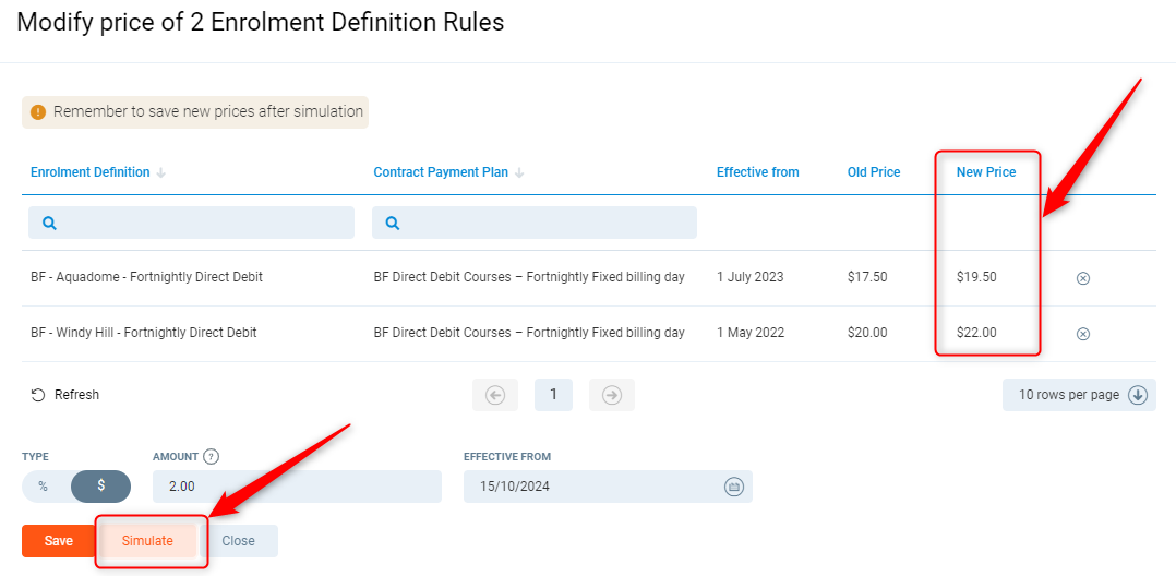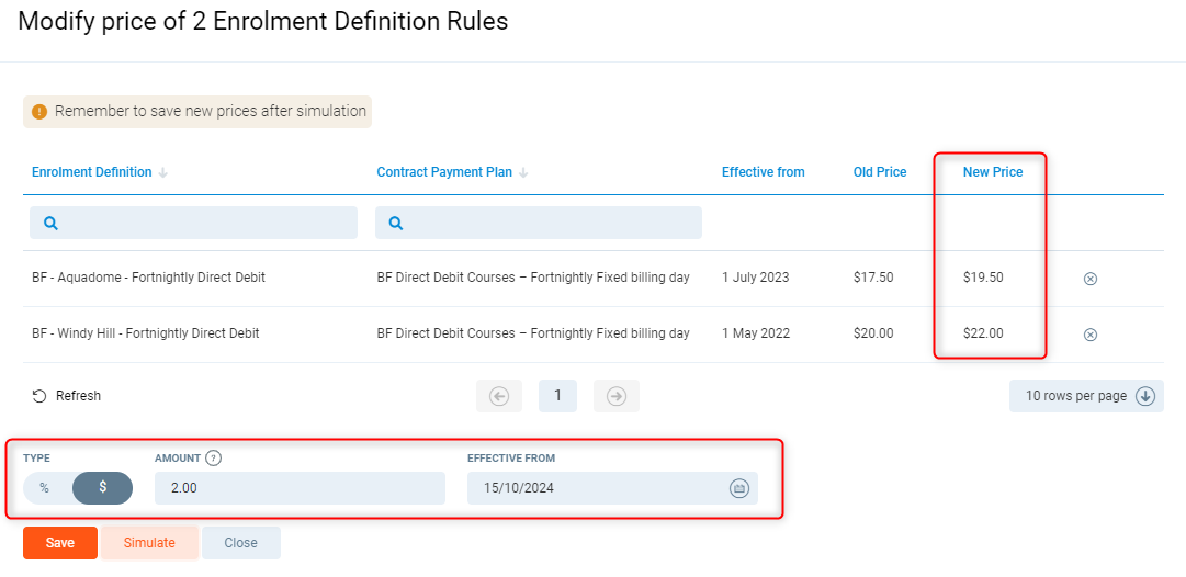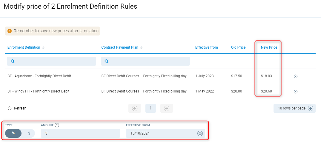 In this example, we have the enrolment rule "Learn to Swim - Fortnightly Fixed billing day" having a price increase on 15/10/2024 from $17.00 to $19.00.