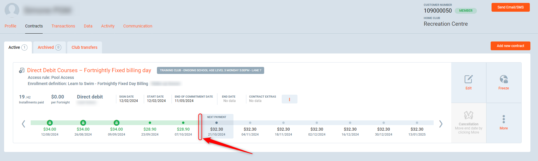 For this member, they will get the price rise on the next payment interval due date (21/10/2024). This is for lessons that occur on 21/10/2024 and 28/10/2024 (after the increase on the 15/10/2024).
