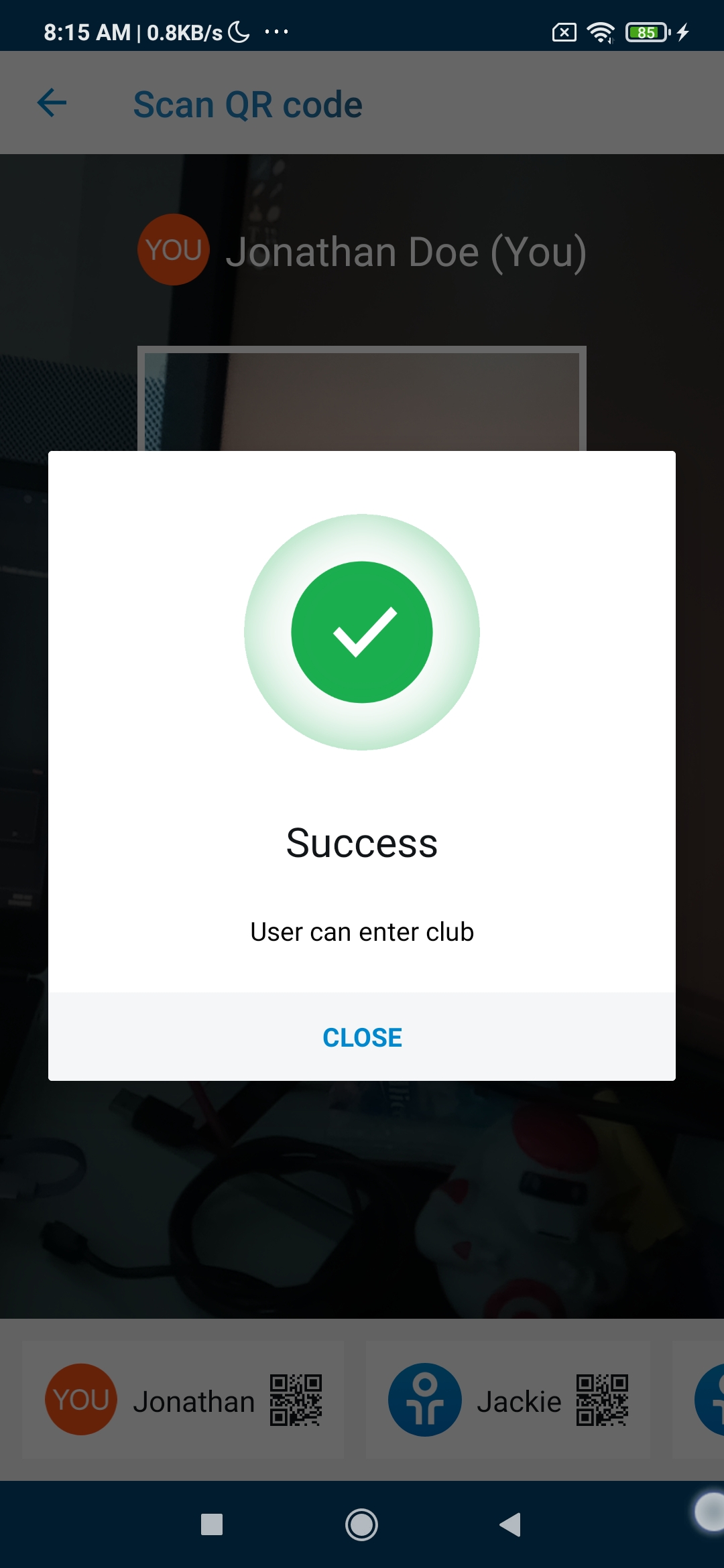 If the scan is valid and the user (or selected family member) has the appropriate permissions, a success modal will appear. The turnstile or gate will open, granting entry to the club or designated zone.
