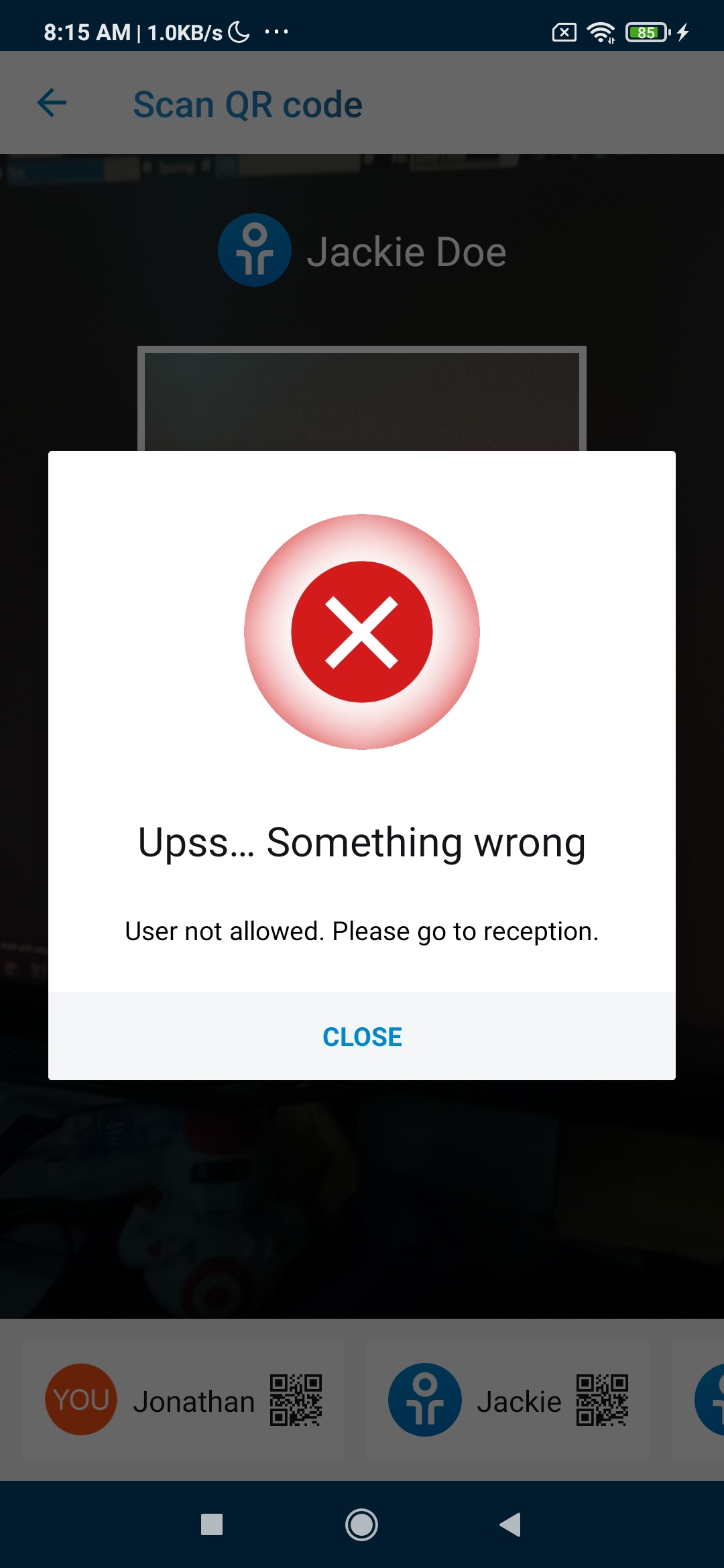 If the scan is technically successful but the user does not have the correct permissions or a system error occurs, a failure popup will appear. The gate will remain closed, and the user will need to seek assistance.