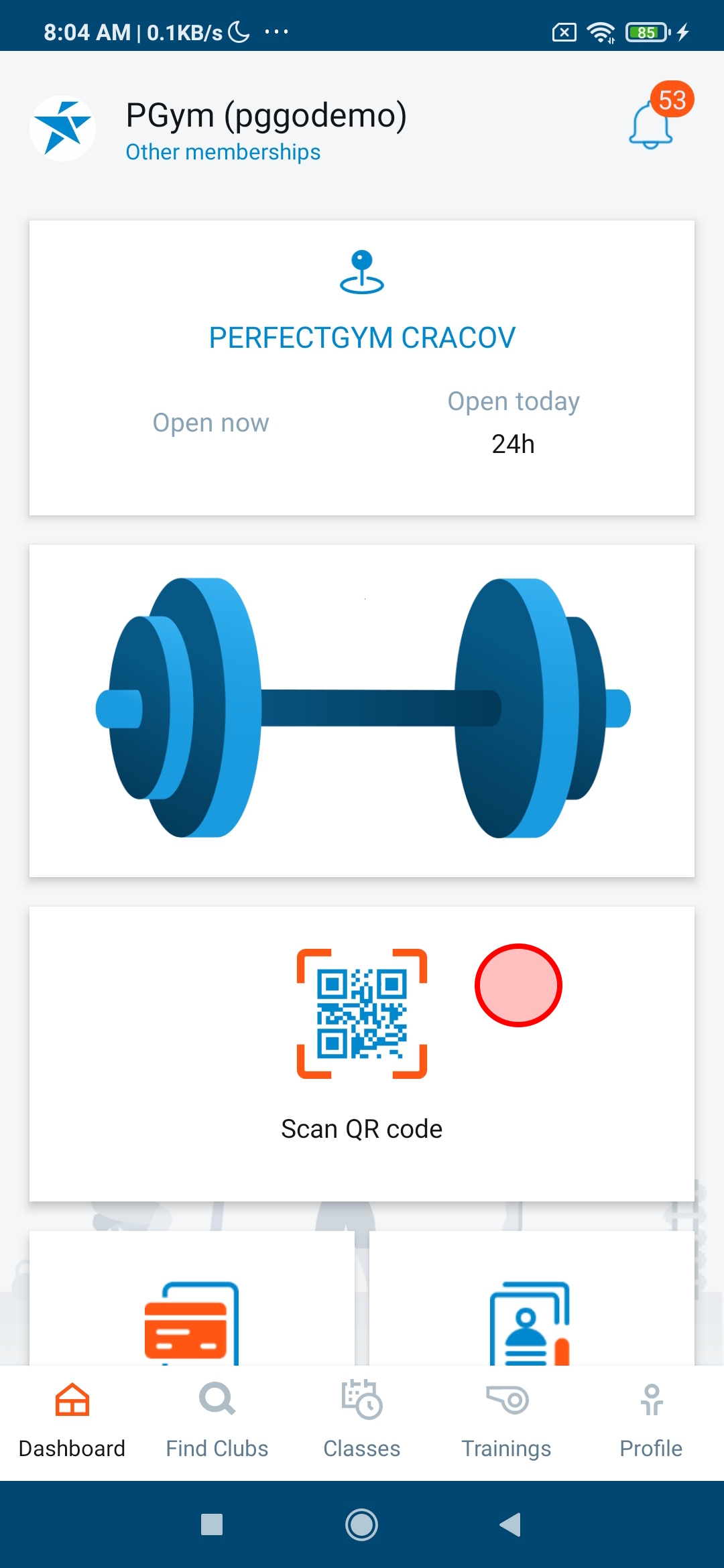 Mobile check-in via QR code scanning must be set up first, otherwise, the "Scan QR code" tile will not be visible on the mobile app dashboard. Contact the PerfectGym Support Team and ask them to enable this feature for you.