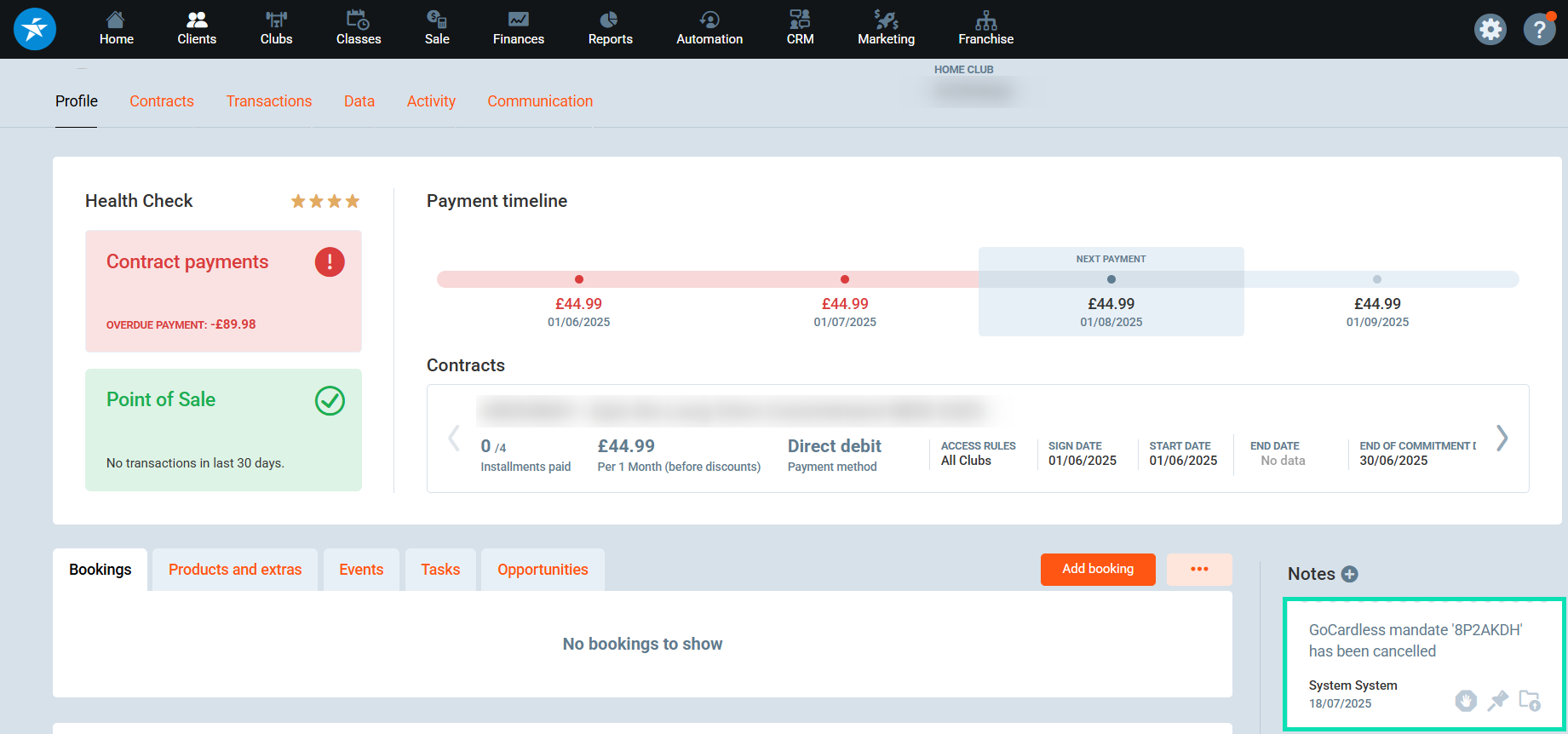 3. A note is automatically added to the member's profile indicating that the mandate was cancelled. The date of the note shows when Perfect Gym received this information from GoCardless.