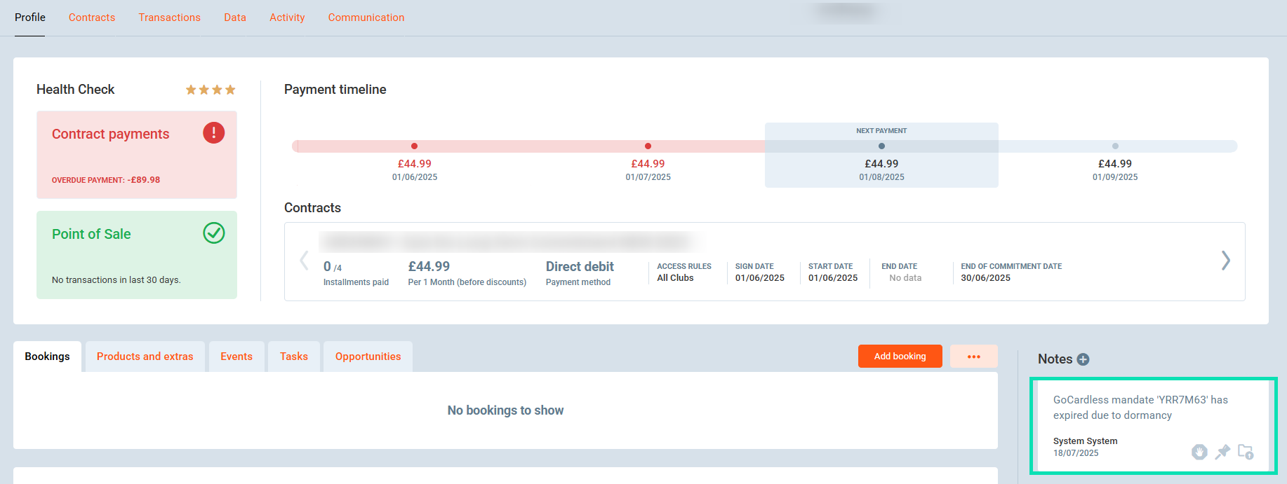 3. A note is automatically added to the member's profile indicating that the mandate has expired. The date of the note shows when Perfect Gym received this information from GoCardless.