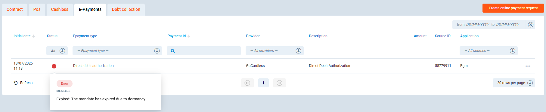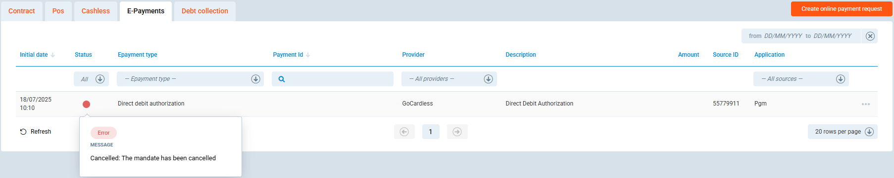 Transactions / E-Payment / Direct debit authorizationtab for an 'Error' status. -