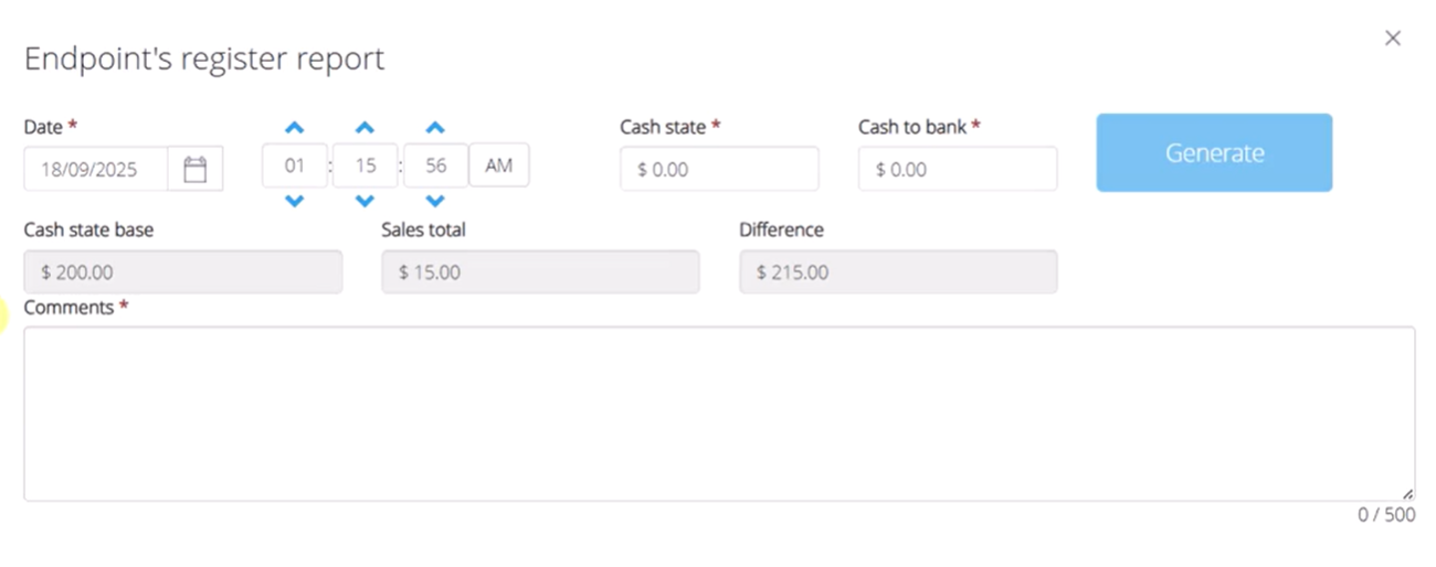 After inserting the amounts and comments, if the difference value is not '0' and you are sure that all values are correct, you can generate the report and close the shift.