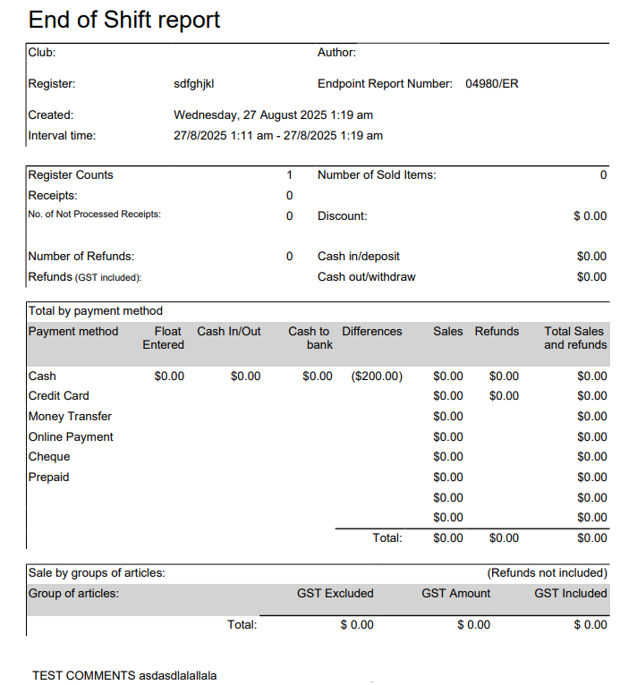 - Difference: Calculated difference showing discrepancies. It counts all fields value in following steps: cash state base + sales total – cash state – cash to bank. It is counted the same as in report ‘Endpoint’s register report’, generated after closing the shift.If the difference is not equal to '0', you will need to insert the comments, why such difference occurred. These comments will be displayed on generated report